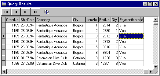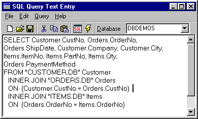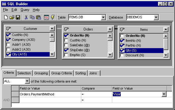 Рис. 16 Вложенные таблицы на этапе выполнения. Такое представление данных даже в случае использования настольных СУБД весьма удобно просто потому, что оно решает общеизвестную проблему нехватки места на форме при наличии нескольких связанных таблиц. Единственное, о чем при этом следует позаботиться, это вызов метода ApplyUpdates компонента TClientDataSet (например, в обработчике события, связанного с выбором какого-либо пункта меню или с нажатием на кнопку): ClientDataSet1.ApplyUpdates(-1); Если не использовать этот метод, данные будут сохраняться только в кэше, которым фактически и является компонент TClientDataSet, а не в самих таблицах. Новый генератор запросов - SQL BuilderВ Delphi 4 в качестве построителя запросов используется SQL Builder, уже знакомый пользователям Visual dBase 7 и C++Builder 3. Он позволяет создавать и выполнять запросы, редактировать созданные SQL-предложения, использовать вычисляемые поля и связи между таблицами, основанные на выражениях.