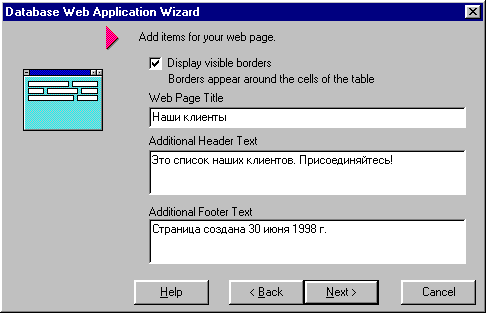 Рис. 26 Ввод заголовка таблицы и дополнительного текста После этого можно открыть полученный компонент TWebModule, выбрать компонент Table1 и установить его свойство Active равным True.