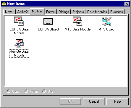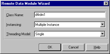 Рис. 31 Создание удаленного модуля данных После выбора соответствующей пиктограммы (например, Remote Data Module) из репозитария объектов и ввода характеристик соответствующего COM-объекта получим удаленный модуль данных, в который можно поместить компоненты доступа к данным.