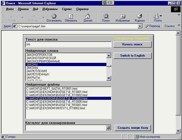 Связка ActiveX - Internet ExplorerА знаете ли вы, что на Delphi можно писать ActiveX компоненты? Конечно знаете. А что с их помощью можно взаимодействовать с Internet Explorer? Это может быть интересно для профессиональных вебмастеров, скажете вы, но я не согласен. "Простой" программист тоже может найти массу применений этому. Здесь будет описано одно из них. Все мы лазим (ходим и т.д.) по интернету. И вы тоже - раз читаете эти строки :). А не случалось ли вам, случайно где-то побывав, что-то прочитав и благополучно забыв адрес сайта через некоторое время вдруг понять, что там было именно то, что вам сейчас срочно понадобилось? Можно конечно посмотреть History браузера, можно залезть в кэш "руками" и попытаться найти там что-то. А можно написать компонент, который бы искал слова в файлах кэша (в общем случае в любых HTML-файлах) и выводил бы на просмотр требуемые файлы. Связать этот компонент с Эксплорером - и вперед. Что удобно - вся работа происходит в эксплорере: и поиск, и,естественно, просмотр. При этом для Delphi-программиста не нужны особые знания языка HTML, скриптовых языков и т.п. Достаточно знать несколько основных конструкций (а уж справочных руководств в интернете очень много). Написанный ActiveX-компонент вставляется в HTML-страничку. Вот пример простейшей странички