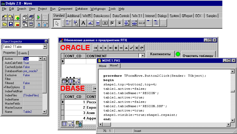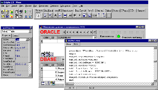 Что интересного может предложть Delphi для разработчиков информационных систем на базе ORACLE? Во-первых, высокопроизводительный драйвер этой СУБД (хотя, конечно, никто не запретит Вам пользоваться ODBC, который, естественно, поддерживается Delphi). Во-вторых, Ваши приложения будут добросовестно цитировать все высказвания созданных на сервере триггеров, если таковые будут срабатывать во время работы приложения. В-третьих, если Вы используете версию 2.0 - в Вашем распряжении репозиторий, включающий словарь данных, навигатор баз данных, SQL-монитор, поддержка хранимых процедур и сессий, модули данных, огромное разнообразие интерфейсных элементов, в том числе и похожих на те, что есть в Oracle Power Objects, а также неограниченные возможности наращивания функциональности среды разработки за счет дополнительных эспертов, редакторов свойств и компонент. В-четвертых, Вы можете легко интегрировать в среду разработки продукты третьих фирм, например, для интерфейса с CASE-средствами (один из таких продуктов, CASE Expert - средство для экспорта ER-диаграммы в словарь данных Delphi, входит в поставку Delphi 2.01). Отметим также, что Delphi 2.0 поддерживает многопоточность, OLE-automation и другие механизмы и технологии 32-разрядных операционных систем Windows. В Delphi 2.0 имеются эффктивные механизмы обработки транзакций с использванием механизмов кэшированного обновления данных, поддерживается ряд расширений SQL, имеется Data Pump Expert для переноса данных между серверами и масштабирования приложений. В обеих версиях Delphi Client/Server имеется визуальный конструктор запросов, позволяющий сгенерировать многотабличный запрос на языке SQL, в том числе с вычисляемыми полями (интерфейс и рабочий экран этого конструктора напоминает по внешнему виду некоторые популярные CASE-средства). Помимо этого, Delphi прекрасно работает с Personal Oracle, что существенно облегчает разработку и отладку приложений, позволяя вынести эти процессы за пределы сети, в которой эксплуатируется действующая версия информационной системы. На мой взгляд, у Delphi есть один крупный недостаток - созданные приложения не являются многоплатформенными и могут эксплуатироваться только в Windows 95 и NT в случае версии Delphi 2.0, а также дополнительно в Windows 3.1 и 3.11 в случае версии Delphi 1.0 . Но и этот недостаток можно преодолеть путем использования технологии Intranet в корпоративных системах, когда приложение, созданное на Delphi, запускается Web-сервером, а полученные формы отображаются в Web-броузере на компьютере пользователя, где может быть использована любая другая операционная система, отличная от Windows. Таким образом, Delphi Client/Server 1.0 и Delphi Client/Server Suite 2.0 являются очень удобными инструментами для создания клиентских приложений, использующих серверы ORACLE. Об этом свидетельствует высокая популярность этого средства среди разработчиков программ. Если Вы выбрали это средство - Вы всегда найдете друзей и единомышленников, готовых помочь Вам в случае появления каких-либо проблем, в том числе и в фирме "Интерфейс", имеющей авторизованный учебный центр Borland и консультационную службу.