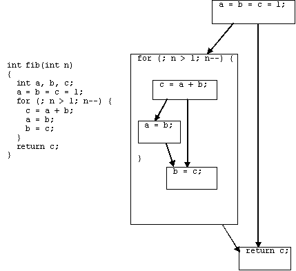 Рис. 1. Пример функции и ее DDG. 2.1.1. Граф зависимостей по даннымПри разделении программы на нити прежде всего нужно учитывать зависимости по данным. Поэтому естественно потребовать, чтобы промежуточное представление программы содержало легкодоступную информацию о зависимостях по данным между различными частями программы. В то же время необходимо максимально отразить сведения о "естественном" параллелизме программы, причем на разных уровнях - от отдельных инструкций, до более крупных программных блоков. Представлением, обладающим всеми необходимыми нам свойствами, является иерархический граф зависимостей по данным, используемый в [9] (data dependence graph, DDG). Узлом такого графа может являться: