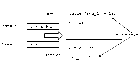 Рис. 2. Пример синзронизации Для учета событий локальности для каждой нити необходимо эмулировать кэш процессора, на котором она выполняется. При распределении текущего узла на какую-либо нить необходимо проверить все переменные, которые читаются либо пишутся узлом, на попадание в кэш. Если попадание произошло, то время выполнения узла должно быть уменьшено на интервал времени t3, также являющийся параметром алгоритма.