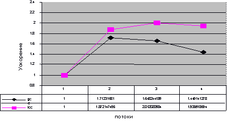 Рис. 3. Пример эмулирования кэша Для учета событий как временной, так и пространственной локальности необходимо моделирование линий кэша, т.е. помещение в кэш не одной переменной, а некоторого блока памяти, окружающего нужную переменную. Моделирование различных типов кэшей приведет к разным результатам при разделении на нити. Пример моделирования событий локальности изображен на Рис. 3. 2.2. Экспериментальные результатыМы применили нашу реализацию алгоритма к тестовой функции, решающей алгебраическое уравнение четвертой степени x4+ax3+bx2+cx+d=0. Функция не содержит циклов и не может быть распараллелена традиционными способами. Полученная многопоточная версия функции была реализована с помощью библиотеки pthread под операционной системой Linux. Экспериментальные запуски были проведены на четырехпроцессорном Intel Itanium, на которых установлена ОС RedHat Linux 7; использовались компиляторы GCC 3.3.1 и ICC 8.00b. Программа запускалась 100 раз, время ее выполнения измерялось с помощью высокоточных аппаратных счетчиков. Вычислялось среднее значение времени выполнения μ и среднеквадратичное отклонение σ. Все значения времени выполнения, не укладывающиеся в промежуток [μ-2σ,μ+2σ] удалялись из выборки, после чего среднее значение пересчитывалось. Эта величина использовалась для подсчета ускорения. Результаты эксперимента приведены на Рис. 4.
