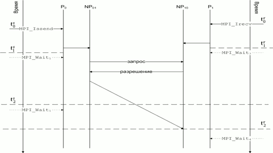 где p – номер вычислителя, а цикл по p определяет распределение данных по вычислителям. Таким образом, исходный цикл расщепился на 200 цепочек вычислений, каждая из которых может выполняться независимо. После того, как данные распределены по вычислителям, прикладному программисту необходимо выбрать такие операции обмена данными и так трансформировать свою программу, чтобы добиться максимально возможного перекрытия вычислений и обменов данными. Среда ParJava позволяет решать этот вопрос в диалоговом режиме, используя интерпретатор параллельных программ (инструмент “Interpreter”). В тривиальных случаях даже использование стандартных коммуникационных функций (MPI_send, MPI_receive) позволяет достичь достаточного уровня масштабируемости. Однако, в большинстве случаев это невозможно, так как приводит к большим накладным расходам на коммуникации, а это в соответствии с законом Амдаля существенно урезает масштабируемость. Достичь перекрытия вычислений и обменов для некоторых классов задач позволяет использование коммуникационных функций MPI_Isend, MPI_Ireceive совместно с функциями MPI_Wait и MPI_Test. Это поясняется примером 2. Пример 2. Как видно из схемы на рис. 1, необходимо добиться, чтобы во время передачи данных сетевым процессором (промежуток между моментами времени