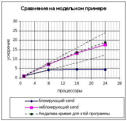 Подбор оптимальных коммуникационных функций требует многочисленных интерпретаций различных версий разрабатываемой программы. Для ускорения этого процесса строится «скелет» программы и все преобразования делаются над ним. После достижения необходимых параметров параллельной программы автоматически генерируется вариант программы в соответствии с полученным коммуникационным шаблоном. Проиллюстрировать важность оптимального выбора операций пересылок можно на следующем «скелете» реальной программы моделирования торнадо (рис. 2а). Если в рассматриваемом «скелете» заменить блокирующие операции Send и Recv на неблокирующие и установить соответствующую операцию Wait после гнезда циклов получится «скелет», представленный на рис. 2б. На рис. 3 приведены графики ускорения «скелетов» программы представленного на рис. 2а и 2б. Как видно, такая замена существенно расширила область масштабируемости программы. При этом окончательная версия «скелета», удовлетворяющая требованиям прикладного программиста, используется для построения трансформированной исходной программы.