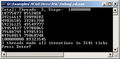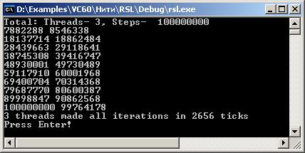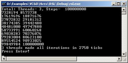 Таким образом, последний эксперимент с многопоточной программой убеждает, что не надо даже и вносить изменения в программный код, чтобы получить результат работы программы, который отличается от предыдущего ее запуска. Мир - удивителен! Но еще большее удивление можно испытать от непредсказуемой работы многопоточных программ! Зная об этом, с этим можно бороться тем или иным образом, но результат такой "борьбы" и есть то сложное и трудоемкое многопоточное программирование. Но самое опасное, что и это не дает полной гарантии от непредсказуемого (случайного) поведения подобных программ, поскольку такое поведение - одна из особенностей многопоточной модели параллельных вычислений. |