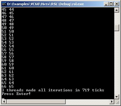 Легко видеть, что, получив в свое распоряжение процессор, "тренер" выводит многократно текущие значения счетчиков шагов. Последние не изменяются, т.к. оба "бегуна" простаивают из-за того, что цикл процессора захвачен монопольно "тренером". По числу повторений можно определить число итераций, которые успевает сделать "тренер" в пределах выделенного ему времени процессора. Эксперимент 2. Вставим в цикл "бегуна", прерывание, которое инициирует выход в ядро операционной системы (вызов функции Sleep с нулевым значение параметра "засыпания"). Так мы "насильно" изменим квантование процессора. Дело в том, что пропуски и/или повторы в отображении текущего значения счетчиков происходят потому, что "бегуны" успевают сделать достаточное число шагов, прежде чем тренер начнет выводить их текущее значение. Примечание 1. То, что значения счетчиков разные на одном и том же шаге - такте дискретного времени, тоже непорядок. Ведь спортсмены начали бежать одновременно и бегут с одинаковой скоростью. В результате получим протокол работы программы, который показан на рис.3. Из него видно, что теперь отображается каждый шаг бегуна/бегунов.