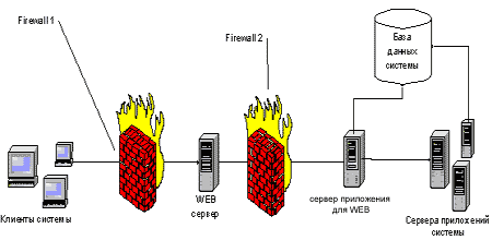 Рисунок 2. Web-сервер - предоставляет доступ к ИС через Интернет посредством Web-интерфейса, который реализуется на технологии ASP.NET. Сервер приложения для WEB - аутентифицирует пользователей, авторизует запросы пользователей, маршрутизирует запросы от Web-сервера к серверам ИС. Реализуются в виде .NET-приложения с возможностью удаленного вызова его методов. База данных системы - хранит данные ИС. Серверы приложений системы - совокупность сервисов, реализующих бизнес-логику ИС. Firewall 1,2 - шлюзы, защищающие ИС от несанкционированного доступа. Протоколы взаимодействияНа рисунке 3 изображена схема взаимодействия компонентов ИС и протоколы взаимодействия.