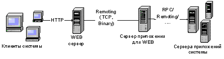 В статье не рассматриваются вопросы, связанные с защитой канала передачи данных. О шифровании трафика можно прочитать тут: http://msdn.microsoft.com/msdnmag/issues/03/06/netremoting/ ЗадачаАрхитектура использованияНа рисунке 1 изображена схема некоторой информационной системы (ИС) ИС состоит из ядра - совокупности серверов приложений, выполняющих бизнес-логику, и Web-интерфейса, расположенного на WEB сервере и предоставляющего доступ к системе через Интернет. В приведенной архитектуре и будет использоваться рассматриваемое решение.