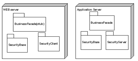 Рисунок 3 Интересующий нас участок цепи: Web-сервер - сервер приложения для Web. Мной выбран протокол взаимодействия .NET Remoting через TCP с бинарной сериализацией по причине высокой эффективности этого сочетания по сравнению с HTTP вместе с SOAP. Идея решенияИдея решения состоит в реализации аутентификации на уровне канальных приемников (ChannelSink), встраиваемых в инфраструктуру канала Remoting на стороне клиента и сервера. Аутентификационная информация передается в заголовках запроса (TransportHeaders), результаты аутентификации передаются в заголовках ответа сервера. Авторизация выполняется с помощью декларативной проверки соответствия роли пользователя. В случае успешной аутентификации на сервере приложения создается пользовательская сессия, в которой сохраняются пользовательские данные. Другая пользовательская сессия создается на Web-сервере, причем стандартный механизм сессий ASP.NET не используется, поэтому его можно отключить в web.config. Сессии на сервере приложения и Web-сервере различны по содержанию, так как сервер приложения может хранить обязательные для каждого пользователя объекты, вполне возможно unmanaged (COM). Взаимосвязь между клиентом, Web-сервером и сервером приложения осуществляется по идентификатору сессии. РазвертываниеНа рисунке 4 приведена диаграмма развертывания рассматриваемого решения.