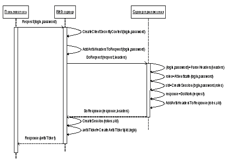 Поддержка сессийОсуществляется с помощью объектов ServerSecurityContext, SecurityContextContainer, ClientSecurityContext на клиентской и серверной сторонах. Инициализация сессии происходит в методах AuthenticateRequest для Web-сервера и в ProcessMessage канального приемника для сервера приложения. Объекты ISecurityContext(ServerSecurityContext, ClientSecurityContext), содержащие состояние сессии, хранятся в коллекции SecurityContextContainer. Ключом к сессии является SID (идентификатор сессии). При инициализации сессия извлекается из коллекции(SecurityContextContainer) и с помощью статического метода Current ассоциируется с текущим потоком выполнения.