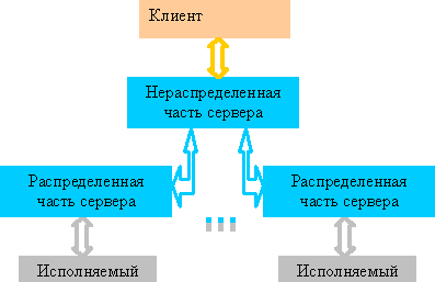 Рис. 1 В ней сервер состоит из двух частей: нераспределенной, которая отвечает за управление параллельной программы как целым, и распределенной, которая отвечает за непосредственное управление выполнением каждого из процессов параллельной программы. Соответственно, нераспределенная часть должна поддерживать модель текущего состояния параллельной программы и, на основании информации, получаемой от распределенных частей обрабатывать "тривиальные параллельные" причины незавершения шага. Рассмотрим, какой информации не хватает в текущем интерфейсе "MPI - отладчик" [7] на примере функции MPI_Send. С помощью этого интерфейса доступна очередь незаконченных посылок для каждого коммуникатора. Элемент этой очереди имеет тип структуры mqs_pending_operation[8] и содержит большое количество информации о посылке. Известно, что реализация MPI самостоятельно принимает решение о том буферизировать, или нет пересылаемое сообщение. В случае буферизации сообщения операция пересылки является локальной и заканчивается вне зависимости от соответс-твующего запроса на прием. В противном случае она не является локальной и не может закончиться, если не был выдан соответствующий запрос на прием. Для того, чтобы передать эту информацию компоненте отладчика, связанной с конкретным процессом, достаточно просто добавить в структуру mqs_pending_operation еще одно поле, которое говорило бы о том было ли сообщение буферизировано или нет. Построение полного интерфейса "MPI - отладчик", удовлетворяющего требованиям предлагаемого подхода, не является целью данной работы. Мы просто хотим обратить внимание на то, что он может быть получен путем незначительной доработки уже имеющегося интерфейса. Мы реализовали предлагаемый подход в отладчике для языка параллельного программирования mpC, который описан ниже. 4. Язык параллельного программирования mpCЯзык параллельного программирования mpC был разработан в конце 90х в Институте системного программирования РАН. В языке mpC, который является расширением языка С, вводится понятие вычислительного пространства, которое определяется как некоторое доступное для управления множество виртуальных процессоров. Основным понятием mpC является понятие сетевого объекта или просто сети. Сеть является областью вычислительного пространства, которая может быть использована для вычисления выражений и выполнения операторов. Размещение и освобождение сетевых объектов в вычислительном пространстве выполняется аналогично размещению и освобождению объектов данных в памяти. Концептуально, создание новой сети инициируется процессором уже существующей сети. Этот процессор называется родителем создаваемой сети. Родитель всегда принадлежит создаваемой сети. Единственным виртуальным процессором, определенным от начала и до конца выполнения программы, является предопределенный виртуальный хост-процессор. Любой сетевой объект, объявленный в программе, имеет тип. Тип специфицирует число и производительности процессоров. Например, объявление