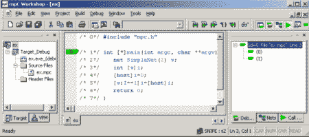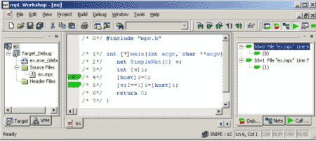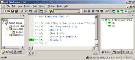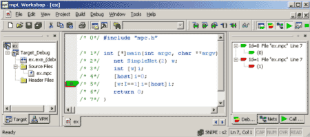 Имея объявление сетевого типа, можно объявить идентификатор сетевого объекта этого типа. Например, объявление в строке 2 вводит идентификатор w сетевого объекта состоящего из 2 виртуальных процессоров. Объект данных, распределенный по некоторой области вычислительного пространства, составляется из обычных (нераспределенных) объектов одного типа, размещенных в процессорных узлах этой области таким образом, что каждый процессорный узел содержит одну и только одну компоненту распределенного объекта. Например, объявление в строке 3 вводит целую переменную i, распределенную по сети w. Конструкция [w] представляет собой спецификатор распределения переменной. В данной программе используются спецификаторы распределения [*] и [host], соответствующие всему вычислительному пространству и хост-процессору соответственно, а также [w:I==1], выделяющий узел сети w с координатой I, равной 1. Отметим, что хост-процессор имеет в этой сети координату 0. Оператор в строке 4 присваивает компоненте переменной i, расположенной на хост-процессоре, значение 0. Это локальное присваивание. Присваивание в строке 5 является расширением присваивания языка С. Оно присваивает компоненте переменной i, расположенной на узле сети w с координатой I, равной 1, значение компоненты переменной i, расположенной на хост-процессоре. Это распределенное присваивание. Компилятор транслирует текст исходной программы на mpC в ANSI C-программу с обращениями к функциям системы поддержки времени выполнения. Используется SPMD-модель целевого кода, когда все процессы, составляющие параллельную программу, выполняют одинаковый код. Система поддержки времени выполнения управляет вычислительным пространством, которое отображается на некоторое число процессов, выполняющихся на целевой вычислительной машине с распределенной памятью (например, на сети ПК и рабочих станций), а также обеспечивает передачу сообщений. Она полностью инкапсулирует конкретный коммуникационный пакет (в настоящее время, подмножество MPI 1.1) и обеспечивает независимость компилятора от конкретной целевой платформы. 5. Отладчик mpC-программmpC Workshop является интегрированной средой разработки и выполнения mpC программ для Windows, разработанной в Институте системного программирования РАН для компании ATS (www.atssoft.com). Он состоит из набора инструментов, поддерживающих все стадии разработки и выполнения mpC-программ, основным из которых является отладчик mpC-программ. С каждым виртуальным процессором (процессом параллельной программы) отладчик связывает курсор, который указывает на его текущую выполняемую строку. Курсор имеет цвет, который указывает на его статус. Цвета определяются в соответствии со стилем светофора, то есть, зеленые курсоры могут выполнить команду перемещения, желтые могли бы выполнить команду перемещения, но остановлены пользователем и, наконец, красные курсоры не могут выполнить команду перемещения, так как они не закончили один из предыдущих шагов и ожидают синхронизации с другими виртуальными процессорами для его завершения. Курсоры одного цвета, указывающие на одну и ту же строчку, объединяются в составной курсор. Существует возможность поменять цвет, как у всего составного курсора, так и у некоторых входящих в него курсоров. Можно менять цвет курсора только с желтого на зеленый и наоборот. Красный цве