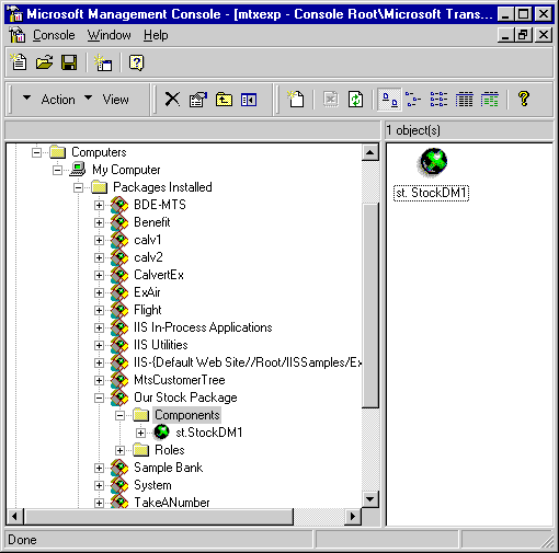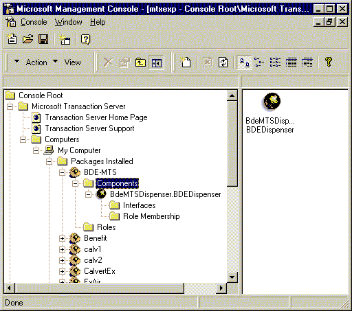 4. Пример 1: создание простейшего серверного объектаПредварительная подготовка Прежде чем приступить к созданию серверных объектов, предназначенных для работы под управлением MTS, следует убедиться в том, что сам MTS и Delphi 4 установлены корректно. Во-первых, NT Option Pack, содержащий MTS, следует обязательно установить до установки Delphi. Тогда в процессе установки Delphi при обнаружении инсталляционной программой установленной копии MTS в него будет добавлен специальный "пакет" (package) BDE-MTS, содержащий объект BdeMTSDispenser (его можно обнаружить с помощью MTS Explorer, рис. 2).