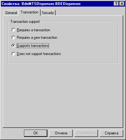 Рис. 2. BdeMTSDispenser, зарегистрированный в Microsoft Transaction Server Следует также убедиться, что данный объект поддерживает транзакции. C этой целью нужно из контекстного меню объекта BDEDispenser выбрать опцию Properties и в появившейся диалоговой панели выбрать закладку Transaction (рис. 3):