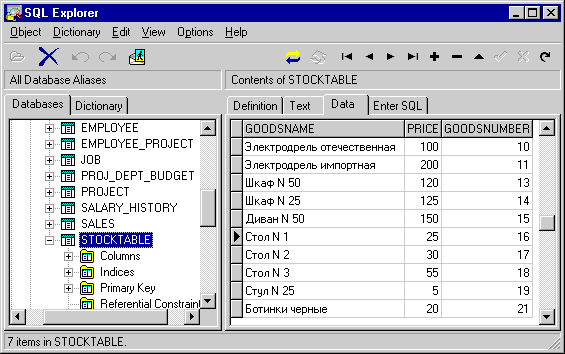 Рис. 5. Таблица STOCKTABLE, созданная на сервере IB Database Следующую таблицу создадим в формате Paradox (например, с помощью Database Desktop) и поместим в базу данных DBDEMOS, поставляемую вместе с Delphi. Структура этой таблицы приведена на рис. 6.