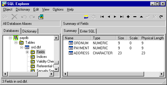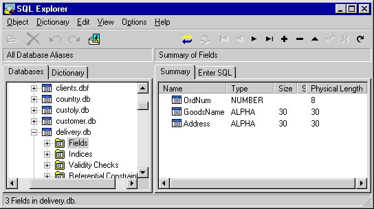 Рис. 6. Структура таблицы delivery.db В этой таблице будут храниться данные о заказах на доставку товаров со склада (номер позиции на складе, название товара, адрес доставки). И, наконец, третья таблица формата dBase должна быть создана в произвольном каталоге, и этот каталог должен быть описан как псевдоним PAYDB (рис. 7):