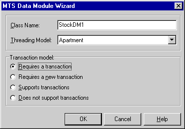 Рис. 9. MTS Data Module Wizard После этого будет сгенерирована стандартная библиотека типов, связанная с созданным модулем данных. В созданный модуль данных поместим один компонент TSession, один компонент TDatabase, один компонент TProvider, один компонент TTable, два компонента TQuery (рис. 10):