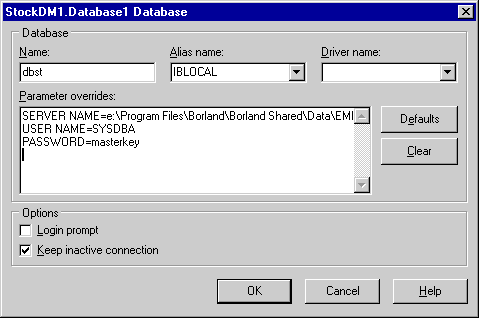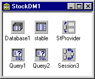 Рис. 10. Модуль данных серверного объекта StockDM1, управляющего таблицей STOCKTABLE Свойство AutoSessionName компонента TSession установим равным True. Свойство SessionName компонента TDatabase установим равным имени компонента TSession (это делается для того, чтобы не было конфликтов между именами различных пользовательских сессий внутри процесса MTS при создании нескольких однотипных объектов). Свяжем компонент TDatabase с псевдонимом IBLOCAL, установив его свойство LoginPrompt равным False (вполне очевидно, что в серверном объекте диалог ввода пароля появляться не должен - ведь клиентское приложение, использующее его, может находиться на удаленном компьютере, рис. 11).