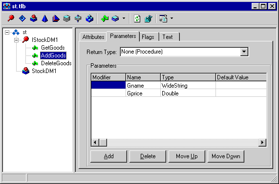 Рис. 11. Параметры компонента TDatabase серверного объекта StockDM1 Свяжем компоненты TTable и TQuery с компонентом TDatabase, и в качестве значения свойства TableName выберем имя вновь созданной таблицы STOCKTABLE. Свяжем компонент TProvider с компонентом TTable. Далее установим значения свойств SQL компонентов TQuery: insert into STOCKTABLE values(:a,:b,GEN_ID(GEN1,1)) и delete from STOCKTABLE where GOODSNUMBER=:C Первое из SQL-предложений добавляет запись в таблицу STOCKTABLE с автоматической генерацией первичного ключа. Второе удаляет запись на основе значения первичного ключа. Обратите внимание: ни компонент TTable, ни компонент TProvider не следует экспортировать из модуля данных. Причина этого заключается в том, что подобные экспортированные объекты хранят состояние данных, с которыми работает конкретное клиентское приложение, поэтому при коллективном использовании таких объектов могут возникнуть коллизии. По этой причине сведения о состоянии данных для конкретных клиентов хранятся менеджером разделяемых свойств MTS (MTS shared property manager), а в модулях данных между вызовами методов эти сведения присутствовать не должны. Поэтому вместо экспорта объектов из модуля данных мы создадим метод GetGoods, предоставляющий эти данные клиентскому приложению по его запросу. После этого можно отредактировать библиотеку типов. Добавим к ней методы GetGoods для передачи клиентскому приложению содержимого таблицы и методы AddGoods и DeleteGoods для выполнения запросов, содержащихся в компонентах TQuery (рис. 12):