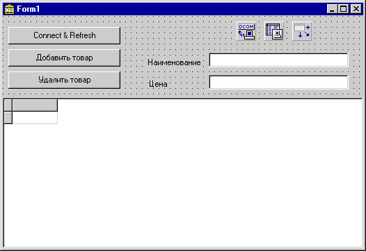 Рис. 14. Клиентское приложение для тестирования серверного объекта В качестве свойства ServerName компонента TDCOMConnection выберем имя только что созданного нами серверного объекта (оно будет доступно, если объект зарегистрирован в MTS, и при его выборе свойство GUID будет установлено автоматически). Если же клиент разрабатывается на удаленном компьютере, следует заполнить свойства GUID и ComputerName, причем в качестве свойства GUID следует выбирать не идентификатор сервера, а идентификатор соответствующего класса объектов - так называемый CoClass GUID. Причина этого очевидна - в общем случае динамически загружаемая библиотека может содержать несколько классов серверных объектов. Свяжем компонент TClientDataSet с компонентом TDCOMConnection, выбрав его свойство RemoteServer из единственной позиции выпадающего списка. Свойство ProviderName оставим пустым - ведь при создании сервера мы не экспортировали никаких объектов. Далее свяжем компонент TDataSource с компонентом TClientDataSet, и, наконец, свяжем компонент TDBGrid с компонентом TDataSource. Убедимся, что все невизуальные компоненты неактивны - до возникновения реальной необходимости получить какие-либо данные серверные объекты не должны быть созданы, поэтому установка свойств Active или Connected должна быть произведена на этапе выполнения. Закончив проектирование формы, создадим обработчики событий, связанных с нажатием на кнопки: