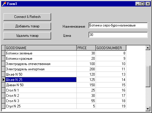 Запустив клиентское приложение, протестируем сервер, попытавшись добавить или удалить записи (заодно проверим правильность текста созданных нами SQL-запросов). Обратите внимание: для контроля изменений в базе данных следует нажимать на кнопку Connect & Refresh - обработчик соответствующего события вызывает серверный метод, выполняющий выгрузку данных из таблицы и передачу их клиентскому приложению (рис. 15):
