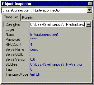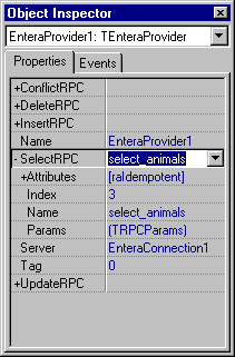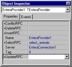 Рис. 2. Свойства компонента TEnteraConnection. Далее свойство Server компонента TEnteraProvider следует установить равным имени компонента TEnteraConnection. После этого следует выбрать из выпадающих списков значения свойств SelectRPC, InsertRPC, DeleteRPC, UpdateRPC. Рис. 3. Свойства компонента TEnteraProvider. Далее следует установить свойство Provider компонента TClientDataSet равным имени компонента TEnteraProvider. Свойство RemoteServer следует оставить пустым (в отличие от случая использования этого компонента с серверами, управляемыми MIDAS). Теперь можно установить свойство Active этого компонента равным true и связать его с источником данных и интерфейсными элементами формы (рис.3.5 )
