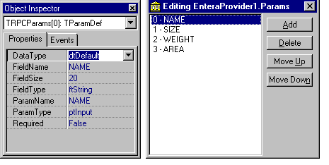 Рис. 5. Вложенные подсвойства свойства SelectRPC компонента TEnteraProvider. Рис. 6. Свойства параметра NAME запроса SelectRPC. Модифицируем клиентское приложение, добавив компонент TEdit и кнопку. Добавим обработчик события, связанный с нажатием на эту кнопку: Код для С++Builder при этом будет выглядеть так: