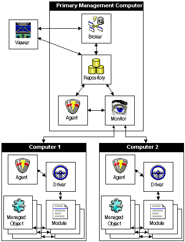 4. Управление функционированием информационной системы предприятия с помощью Inprise AppCenterВ рассмотренных в предыдущем разделе примерах требовалось запускать Entera Broker и серверы функциональности вручную. При эксплуатации системы, содержащей множество подобных серверов функциональности, выполняющихся под управлением различных платформ, процедура запуска необходимых приложений и наблюдения за их выполнением может оказаться весьма трудоемким процессом. Поэтому в таких системах нередко используются специальные средства управления серверами и наблюдения за ними. Inprise AppCenter представляет собой подобное средство, в значительной степени ориентированное на управление серверами функциональности, созданными с помощью Entera, и брокерами Entera. 4.1. Обзор AppCenterInprise AppCenter представляет собой средство управления распределенными приложениями, позволяя осуществлять мониторинг процессов и приложений промежуточного слоя, наблюдать за производительностью компонентов распределенной системы и устанавливать правила их функционирования (такие, как баланс загрузки, связи между приложениями, создание резервных сервисов). AppCenter состоит из пяти компонентов - утилиты просмотра (AppCenter Viewer), агента, монитора, репозитария и брокера.