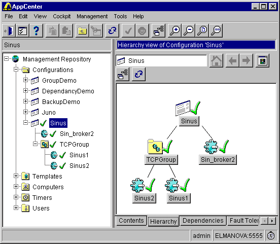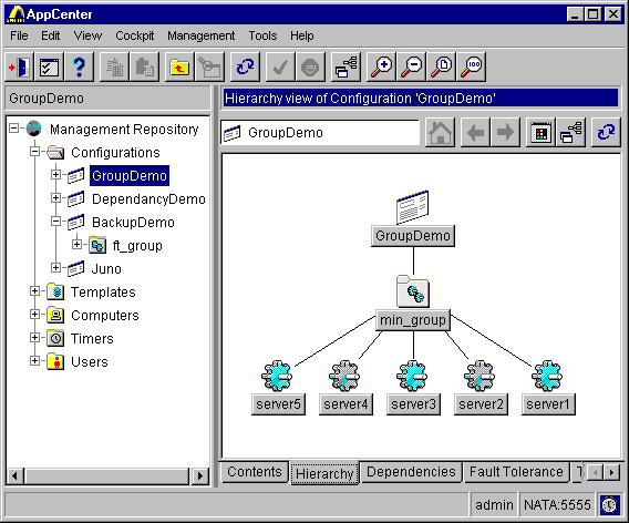 Рис. 19. Иерархия объектов в созданной группе Выбрав из контекстного меню опцию Properties, можно изменить свойства управляемых объектов (например, число попыток повторного запуска после остановки сервера).