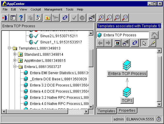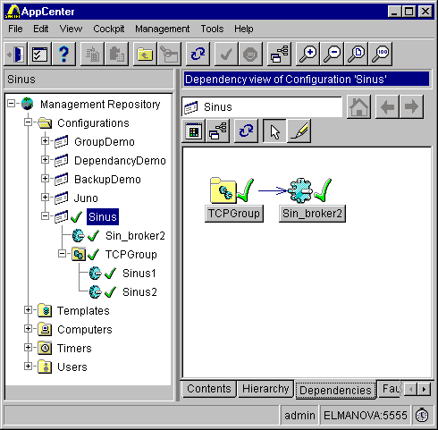 Рис. 22. Связи между сервисами и компьютерами Теперь можно запустить конфигурацию и пронаблюдать, как ппочередно запускаются объекты (в нашем случае исполняемые файлы a1_s.exe). Если это приложение принудительно закрыть, AppCenter будет снова пытаться запустить его, пока не будет достигнуто число попыток, указанное в параметре Weighting. Можно создать конфигурацию и без использования экспертов, выбирая пункт New из соответствующих контекстных меню и определяя свойства вновь созданных объектов. Есть также возможность создания так называемых DUMMY-конфигураций, то есть конфигураций, не соответствующих никаким реальным объектам, с целью моделирования их поведения. Для имитации их поведения можно создавать макросы AppCenter. Примерно так же можно создавать группы приложений, устойчивые к сбоям, в которых имеются основные и резервные дублирующие их объекты. AppCenter обладает возможностью установки самых разнообразных правил функционирования объектов. В частности, можно организовать запуск и остановку конфигураций и отдельных объектов согласно расписанию (для этой цели в AppCenter можно создавать таймеры), определять, какой сервер является дублирующим для данного сервера, и др. Все сведения о конфигурациях, объектах, таймерах хранятся в общем репозитарии. Отметим, что объекты AppCenter обычно создаются на основе шаблонов с заранее предопределенными свойствами. Однако у серверов функциональности могут быть и собственные характеристики, за которыми необходимо осуществлять наблюдение, например, количество или интенсивность RPC-вызовов, объем передаваемых данных. Чтобы наблюдаемые объекты могли предоставлять такие характеристики, они должны содержать экспортирующие их вызовы функций Enterprise Management Interface (EMI) API (обсуждение которого выходит за рамки данной статьи). В этом случае следует создать собственный шаблон управляемого объекта (например, на основе уже имеющегося).