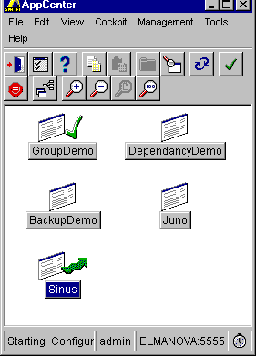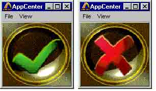 Рис. 25. Режим мониторинга управляемых объектов Еще один режим (Icon Mode) позволяет отображать Viewer в виде пиктограммы, которая меняет вид и становится движущейся, если произошел сбой в работе какого-либо из управляемых объектов: Рис. 26. Отображение AppCenter Viewer в виде пиктограммы в штатном режиме и в случае сбоя одного из управляемых объектов Последний из возможных режимов - Cockpit Mode - позволяет различными способами отображать параметры функционирования объектов (такие, как число обращений клиентских приложений, время отклика и др.), а также вести журнал событий: