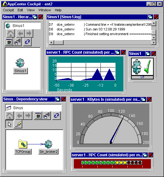Рис. 29. Типичный cockpit на этапе выполнения При этом диаграммы, содержащие динамические параметры, меняются в соответствии с установленным при их создании значением частоты обновления. В заключение отметим, что с помощью Inprise AppCenter можно управлять не только серверами или брокерами Entera, но и любыми другими приложениями, если таковые зарегистрированы в его репозитарии. Российское представительство Inprise: