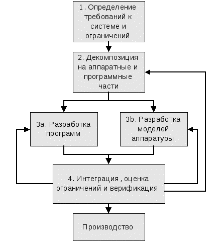 На первом этапе происходит определение требований к системе. Определяются необходимые функциональные характеристики системы и задаются ограничения. Типовыми ограничениями являются быстродействие, энергопотребление, размер и стоимость изготовления кристаллов в рамках заданного технологического процесса производства микросхем. На следующем этапе выполняется декомпозиция системы на аппаратные и программные компоненты (HW/SW partitioning). Принимаются решения об общей структуре системы (в первую очередь, число и характеристики вычислительных блоков) и выполняется отображение требуемой функциональности на программные и аппаратные части. Далее процесс разделяется на две ветви – для проектирования программных и аппаратных компонентов. Выходом аппаратной ветви являются модели аппаратуры. В этой ветви принимаются решения об архитектуре выделенных в системе аппаратных вычислительных устройств. Для программируемых компонентов определяется состав функциональных блоков (включая внешние модули расширений для специфических вычислений), структура памяти (включая регистры) и система команд. Результатом проектирования программной части являются модели программных компонентов, совместимые с соответствующими аппаратными моделями. Процесс носит итеративный характер, и точность описания моделей на каждой итерации постепенно повышается от высокоуровневых функциональных описаний до синтезируемых спецификаций аппаратуры и машинных кодов программ, соответствующих этой аппаратуре. Каждая итерация заканчивается интеграцией результатов программной и аппаратных ветвей, моделированием полученной системы, проверкой функциональной корректности и сбором соответствующих оценок ключевых параметров для их анализа с целью дальнейшей оптимизации. На основании полученных таким образом оценок принимаются решения о пересмотре декомпозиции между программными и аппаратными компонентами, о конкретных изменениях программ и аппаратуры, например, добавлении/удалении вычислительных блоков или оптимизации системы команд. Цикл повторяется до получения конкретных спецификаций программ и аппаратуры, которые совместно задают встраиваемую систему, удовлетворяющую всем заданным требованиям. Затем проводится верификация спецификаций, и цикл проектирования завершается подготовкой отчуждаемого продукта, пригодного для интеграции в более крупные проекты «систем на чипе» (SoC) или для запуска в отдельное производство. Такой продукт обычно включает в себя: