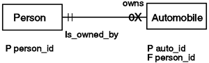 - От одной сущности к другой через отношение. Например, один человек имеет нисколько или сколько угодно автомобилей, и один автомобиль принадлежит точно только одному человеку. Тогда каждый автомобиль будет иметь в качестве внешнего ключа первичный ключ каждого отдельного человека, и этот внешний ключ будет уникально определять владельца.