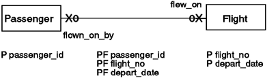 - Внутри отношения, исходя от участвующих в нем сущностей. Например, если пассажир летает, по меньшей мере, ни одним, а, по большей мере, несколькими рейсами, и каждым рейсом летает от нискольких до нескольких пассажиров, то тогда внешний ключ принимает значение первичных ключей сущностей пассажиров и рейса. Взятые вместе, эти ключи определяют уникальным образом для каждого экземпляра отношения соответствующие экземпляры сущностей.