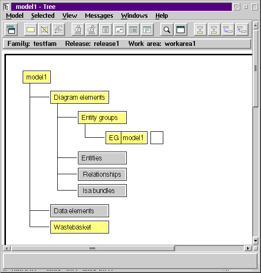 При создании новой модели на экране появляется древообразная структура, отображающая различные элементы ER-модели. Создание новых сущностей начнается с определением дизайнером базы данных новой групы сущностей (рис.4) или импортом уже существующего реляционного дизайна или CASE-модели стороннего производителя.