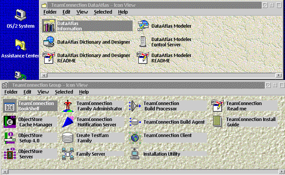 Кроме того существует возможность создания файлов-заголовков на языке PL/I (существующего в реализации IBM для OS/2, Windows 95&NT, AIX, OS/400, OS/390), и планируется в качестве плановых обновлений поддержка языков COBOL и 4GL (системы VisualAge Generator). IBM VisualAge DataAtlas работает как компонент универсальной среды разработчика IBM VisualAge TeamConnection, которая включается в комплект стандартной поставки DataAtlas. Рис.1. Экран TeamConnection и DataAtlas. IBM VisualAge TeamConnection. IBM VisualAge TeamConnection представляет собой систему для многопользовательской работы группы программистов в среде Internet/intranet, базирующуюся на объектной (пост реляционной) базе данных ObjectStore, обеспечивая: