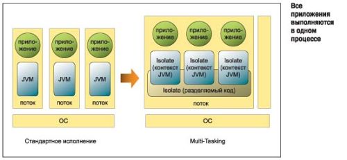 В результате для решения поставленных задач и вновь возникающих проблем, связанных с масштабируемостью и надежностью, был создан Barcelona Project. В кратком описании этого проекта явно сформулирована его цель: превратить Java в полноценную операционную среду. Метод: прозрачное разделение метаданных (системных данных) между приложениями. Первоначально было решено не менять существующую виртуальную машину в корне, но дополнить ее модулем, который, по замыслу, должен отвечать за совместно используемые ресурсы и эффективно кэшировать их. Каждая запускаемая копия виртуальной машины загружала очередную порцию классов в общую область — и таким образом эффект кэширования для каждого следующего экземпляра VM проявлялся все лучше. На следующем этапе были переработаны основные библиотеки, в которых были выделены реентерабельные блоки кода "только для чтения". Часть данных, составляющая состояние приложения, которая не может быть разделена между приложениями, включает глобальные переменные, которые в терминах Java представлены статическими членами системных и пользовательских классов. Код — как данные только для чтения — по определению поддается повторному использованию, а значения динамических членов не нуждаются в реентерабельности. Прирост быстродействия и экономии памяти для обоих подходов составил около 10%, однако главная цель не была достигнута, поскольку основное время при запуске приложения составляет запуск самого Java Runtime. То есть, запуская новые виртуальные машины, никогда не удастся достичь желаемой гибкости, особенно для небольших приложений, таких как утилиты командной строки. Поэтому было решено вынести Runtime в категорию (квази-)резидентных в памяти программ (демонов, сервисов) и сделать Java многопоточной и реентерабельной средой для множества приложений. Таким образом, JRE запускается только один раз (возможно — только при запуске компьютера), и накладных расходов типа "CreateProcess" при запуске отдельных приложений, в том числе и первого, не возникает. На данном этапе существует прототип многопоточной виртуальной машины, MVM, основанной на Hot Spot Virtual Machine и соответствующем компиляторе. Основным принципом построения новой машины, по словам Гжегожа Чайковски (Grzegorz Czaikowski), руководителя проекта Barcelona, стала проверка всех компонент Java VM на предмет разделения функциональности между приложениями. В результате каждая выполняемая программа требует только ограниченных частных ресурсов, связанных с состоянием приложения. Большинство кода и метаданных теперь обслуживают все приложения одновременно. В частности, удалось сделать реентерабельными в рамках многопоточной виртуальной машины стандартные библиотеки классов, которые используют все без исключения приложения. В результате скорость запуска приложений возросла на 60…90% — и для большинства приложений, в том числе и графических, составляет теперь около одной секунды. Стало возможным даже реализовать такие системные утилиты, как ls или grep,— раньше этому препятствовало значительное время запуска, которое сводило на нет преимущества эффективности таких команд. Оперативная память, занимаемая приложением, сократилась в полтора-два раза за счет повторного использования стандартных модулей. Когда одно приложение требует модуль, то он уже, как правило, загружен и находится в кэше 