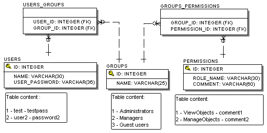 то запрос ролей-прав будет выглядеть, например, так: SELECT PERMISSIONS.ROLE_NAME, 'Roles' FROM PERMISSIONS, USERS WHERE (USERS.ID = PERMISSIONS.USER_ID) and (USERS.NAME = ?) Как вы можете увидеть, структура таблиц аналогична использованию модуля на основе users, roles файлов, где для каждого пользователя перечисляется его права. Данный подход достаточен для "условно НЕбольшого" количества пользователей и ролей, но становиться трудоемким при "условно большом" количестве пользователей и ролей. Если выбрана более сложная структура с правами, группами, пользователями, например, так: