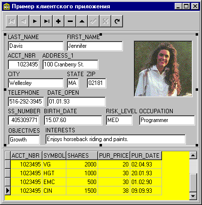 Рис.7. Главная форма клиентского приложения Теперь можно скомпилировать и запустить приложение. Отметим, что при запуске приложения из среды разработки с сервером приложений соединены два клиента - среда разработки и скомпилированное клиентское приложение. При желании можно с помощью утилиты SQL Monitor проследить, какие именно запросы созданный нами сервер приложений направляет серверу баз данных. Данный пример был выполнен на ПК Pentium-120/32 МБ c ОС Windows 95 с использованием. Personal Oracle 7.2 for Windows 95 (90-дневная trial-версия)и Delphi 3.0. При этом во время отладки приложения был постоянно загружен MicrosoftWord 7.0. Назад | Содержание | Вперед |