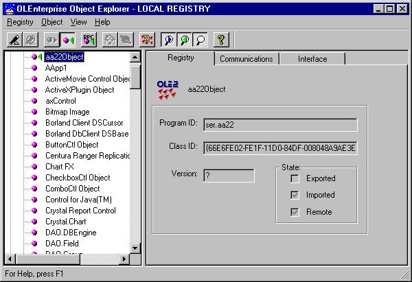 Рис.8. Публикация объекта с помощью Object Explorer На рабочей станции, где будет запущено приложение-клиент, следует запустить Object Explorer и соединиться с реестром компьютера, содержащего сервер приложений (Registry/Connect:). Все экспортированные объекты после этого будут видны в списке OLE-серверов удаленного реестра. Далее следует импортировать выбранный сервер приложений (Object/Import), отметив, что приложение будет выполняться на том компьютере, где оно содержится. После этого можно убедиться, что данный OLE-сервер содержится в реестре рабочей станции (например, запустив входящий в состав операционной системы редактор реестра). Теперь можно слегка изменить клиентское приложение, выбрав значение свойства ComputerName компонента TRemoteServer из списка доступных в локальной сети компьютеров. При попытке установить свойство Connected этого компонента равным True сервер приложений будет найден в реестре и запущен на удаленном ПК. Отметим, что если пользователь редактирует данные в клиентском приложении, они не переносятся непосредственно на сервер баз данных, а вместо этого кэшируются. Для инициации процесса реального сохранения в базе данных используется метод ApplyUpdates компонента TClientDataSet. В качестве параметра этот метод использует целое число, равное максимально допустимому числу ошибок сервера, после которого следует прекратить попытки физического сохранения данных (значение -1 означает, что следует пытаться сохранить все данные независимо от числа ошибок). Почему предусмотрена возможность ошибок сервера? Ответ очевиден - клиентское приложение может ничего не знать о правилах ссылочной целостности и иных ограничениях, содержащихся на сервере баз данных, и только попытка физического сохранения изменений в базе данных может выявить их нарушения (вспомним, что на клиентской рабочей станции может даже не быть библиотеки BDE). Отметим также, что установить связи между таблицами можно как на сервере приложений, так и в клиентском приложении, и разработчик может выбрать, что удобнее с точки зрения эффективности работы и функциональности. Данный пример был выполнен в одном из классов Учебного центра Interface Ltd. Особо хотелось бы обратить внимание на довольно скромные требования к ресурсам как компьютера, содержащего сервер приложений, так и рабочих станций, на которых выполнялись клиентские приложения (табл.1) Таблица 1. Технические характеристики использованных ПК и ПО при соединении клиента и сервера приложений с помощью OLEnterprise