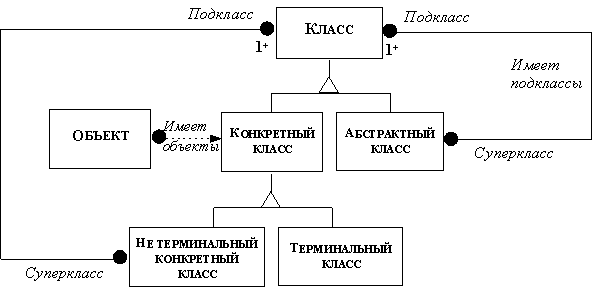 2.1.11. Связь объектов с базой данныхВ объектно-ориентированном проектировании мы имеем дело с множествами взаимосвязанных объектов. Каждый объект может рассматриваться как переменная или константа структурного типа (при таком рассмотрении методы, описываемые в объекте, трактуются как адреса функций, которые разрешено применять к этому объекту). Следовательно, множество объектов - это множество взаимосвязанных данных, т.е. нечто очень похожее на базу данных. Поэтому применение понятий баз данных часто оказывается полезным при объектно-ориентированном анализе и объектно-ориентированном проектировании прикладных программных систем. Рассмотрим на примерах некоторые особенности применения указанных понятий. Метаданные Метаданными называются данные, описывающие другие данные. Например, определение класса - это метаданные, так как класс описывает другие данные - объекты этого класса. Модели являются метаданными, так как они описывают моделируемые объекты. Еще одним примером метаданных является абстрактный класс (см. раздел 2.1.9). Определение абстрактного и конкретного классов может быть представлено с помощью объектной модели, изображенной на рисунке 2.25.