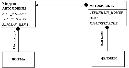 Рис. 2.25. Объектная модель, определяющая абстрактный и конкретный классы Класс описывает множество объектов - экземпляров этого класса. Объекты данного класса порождаются по описанию класса с помощью процесса, называемого тиражированием. Процесс тиражирования можно распространить и на другие случаи порождения экземпляров объектов по образцам. Рассмотрим, например, модели автомобилей, выпускаемых различными производителями. Класс модель_автомобиля имеет свои атрибуты (как например, имя_модели, год_выпуска, базовая_цена) и зависимости (в частности, этот класс связан зависимостью с классом фирма). Но каждая модель_автомобиля может рассматриваться как метакласс, описывающий множество автомобилей, принадлежащих конкретным людям - их владельцам. Каждый класс автомобиль получает атрибуты от своего метакласса, но может иметь и собственные атрибуты (как например, серийный_номер, цвет, комплектация). При этом гораздо удобнее и экономнее получать различные классы автомобиль тиражированием метакласса модель_автомобиля (схематически этот процесс тиражирования представлен на рисунке 2.26). Тиражирование изображается пунктирной стрелкой.