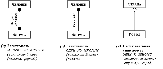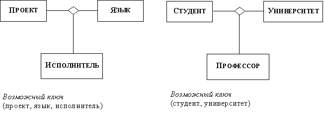 Рис. 2.27. Возможные ключи бинарных зависимостей На рисунке 2.28 рассмотрены две тренарные зависимости. Первая из них определяется таблицей: