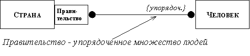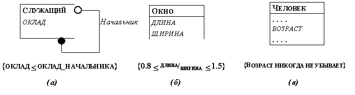 Рис. 2.29. Ограничения на объекты На рисунке 2.29(а - в) представлены ограничения, накладываемые на объекты: (а) зарплата служащего не может превышать зарплаты его начальника (ограничение на значения одного атрибута разных объектов); (б) никакое окно (на экране дисплея) не может иметь отношение длины к ширине, не лежащее в интервале от 0.8 до 1.5 (ограничение на значения разных атрибутов одного объекта); (в) возраст человека не может убывать (ограничение на изменение значения атрибута во времени). Ограничения указываются в фигурных скобках под изображением соответствующего класса на объектной диаграмме (они относятся ко всем объектам этого класса). Обычно ограничения могут быть выражены в виде логических функций (предикатов), которые и представляют их в программе. Ограничения дают один из критериев качества объектной модели: "хорошая" объектная модель обычно содержит много ограничений. Ограничения на зависимости сокращают количество объектов, связанных с данным объектом (соответствующие обозначения уже рассматривались нами ранее). На рисунке 2.30 показан пример другого рода ограничений: показано, что множество объектов на одном из концов зависимости является упорядоченным.