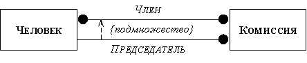 Рис. 2.30. Ограничения на связи На рисунке 2.31 приведен пример общих ограничений на зависимости: указано, что зависимость является_председателем между объектами человек и комиссия есть подмножество зависимости является_членом. Общие ограничения выражаются, как правило, с помощью уравнений. На диаграммах они обозначаются пунктирными стрелками с комментариями в фигурных скобках.
