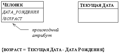 Рис. 2.32. Производный атрибут На рисунке 2.32 показан производный атрибут возраст класса человек, возраст определяется как разность значений объекта текущая_дата (соответствующий класс также показан на рисунке) и атрибута дата_рождения объекта класса человек. На рисунке 2.33 показано, что объект класса машина состоит из нескольких объектов класса узел, каждый из которых может состоять из объектов класса деталь. Каждый узел характеризуется смещением в системе координат, связанной с машиной, а каждая деталь характеризуется смещением в системе координат, связанной с узлом. Для удобства можно для каждого объекта деталь определить систему координат, в которой координаты вычисляются с помощью координат объекта машина, смещения объекта узел и смещения объекта деталь. Эта система координат может быть представлена в производном классе смещение, который связан с каждым объектом деталь производной зависимостью чистое_смещение. Поскольку в реальном мире наблюдается большая избыточность, в объектные модели удобно вводить большое количество производных сущностей.