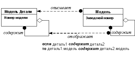 Рис. 2.33. Производный объект и производная зависимость Гомоморфизмы Гомоморфизм - это отображение между двумя зависимостями (как показано на рисунке 2.34). Например, деталь, описанная в каталоге деталей автомобиля, может содержать в себе другие детали (составная деталь), также описанные в этом каталоге. Каждая позиция каталога снабжена номером модели; каждая деталь характеризуется своим серийным номером, причем каждая составная деталь содержит в себе соответствующие детали, также имеющие свои серийные номера. На рисунке 2.34 показаны классы, соответствующие физическим деталям (класс деталь) и их описаниям в каталоге (класс модель_детали), а также зависимости между такими классами (поскольку речь идет о сложных деталях, эти зависимости являются агрегациями зависимости содержит). На рисунке показано отображение диаграмм объектных моделей, соответствующих физическим деталям, в диаграмму объектной модели, соответствующей каталогу. При этом следует иметь в виду, что поскольку разным физическим деталям одного вида (номенклатуры) соответствует одно описание в каталоге, рассматриваемое отображение как бы "склеивает" все диаграммы объектных моделей, соответствующих физическим деталям, в одну диаграмму объектной модели, соответствующей каталогу. Описанное отображение есть один из наиболее типичных примеров гомоморфизма.